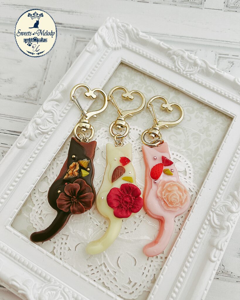 樹脂粘土で猫型チョコレートとお花のパーツを作り、
